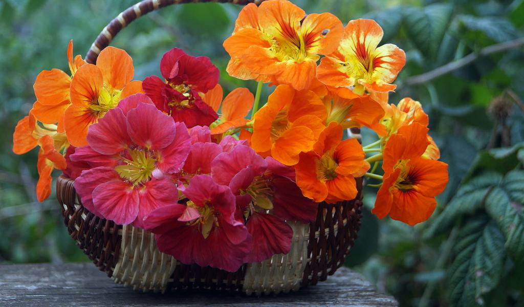 Wallpaper Pink and orange nasturtium flowers in the basket