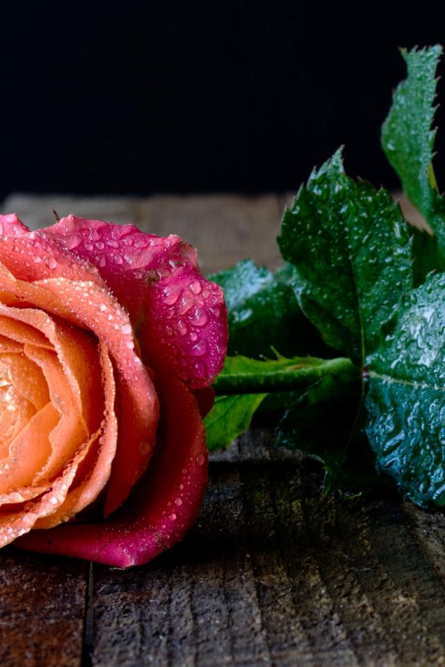 Wallpaper Beautiful multicolored rose flower in drops of dew on a table