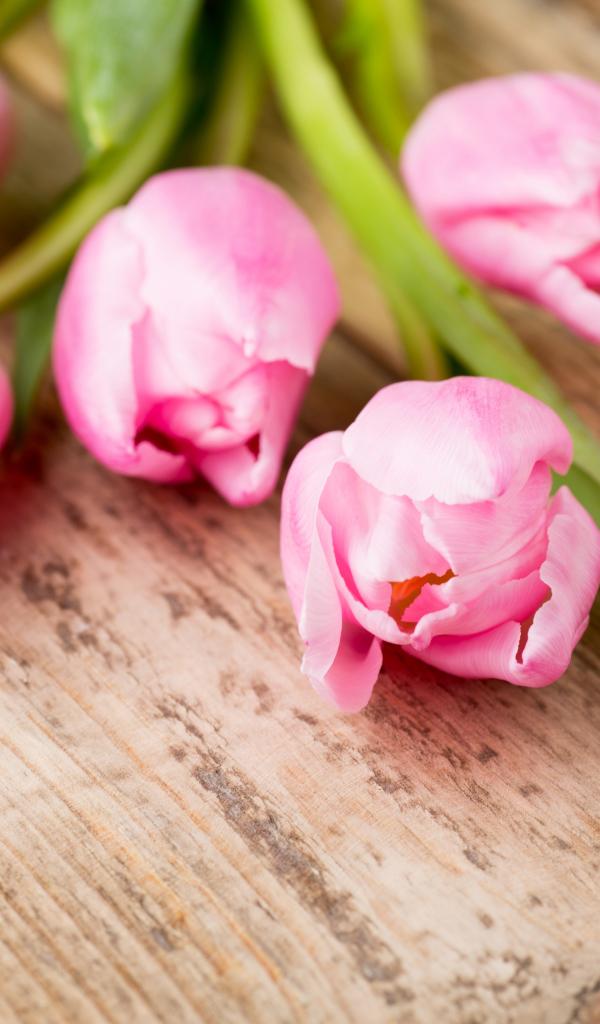 Wallpaper Delicate pink tulips on a wooden table