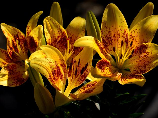 Wallpaper Yellow beautiful tiger lilies on a flower bed closeup