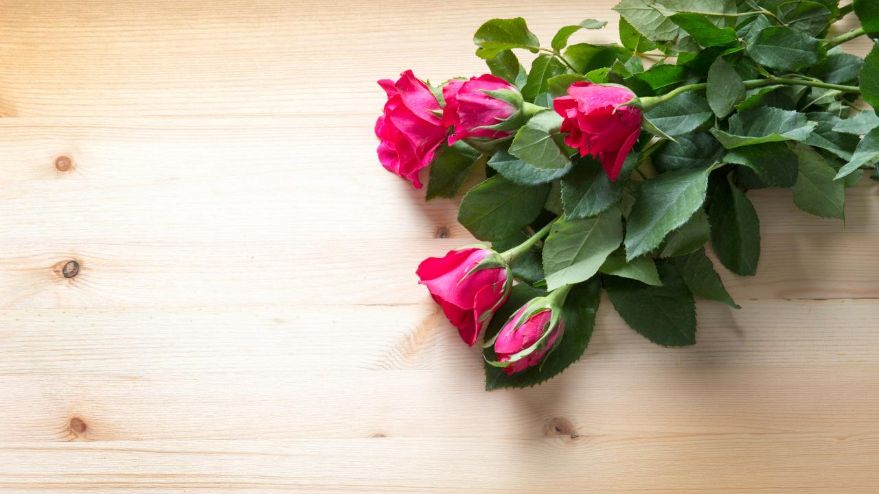 Wallpaper A bouquet of pink roses with green leaves on a wooden surface