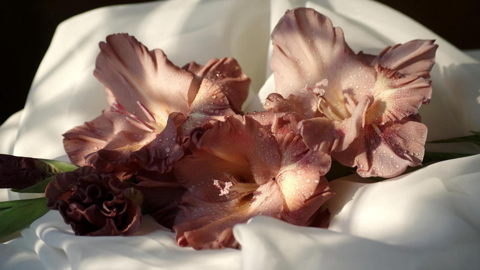Wallpaper Pink flower gladiolus lies on a white bedspread