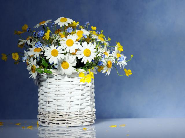 Wallpaper Beautiful tender daisies and forget-me-nots in a wicker vase