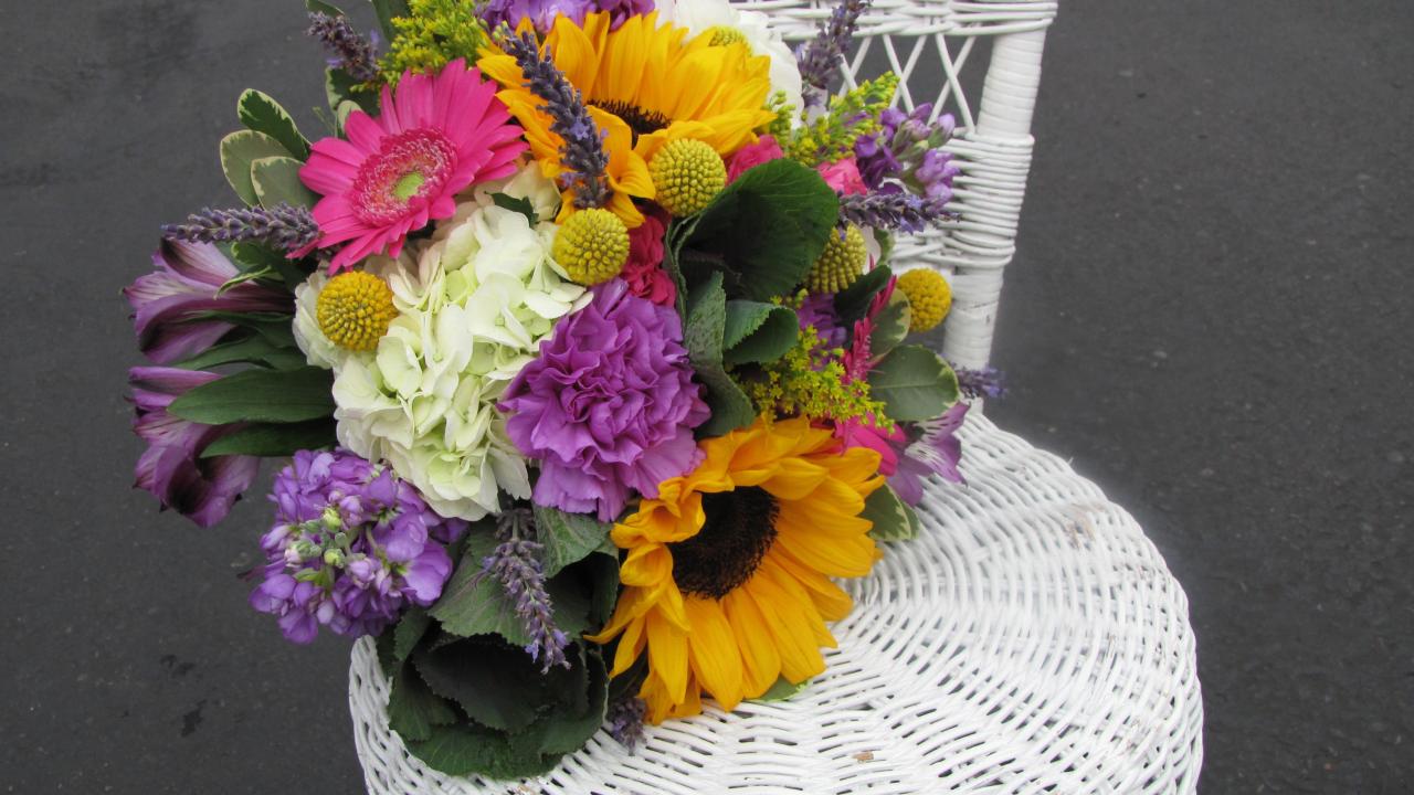Wallpaper Bouquet with pink flowers dahlias, roses, gerberas and phloxes on a white chair