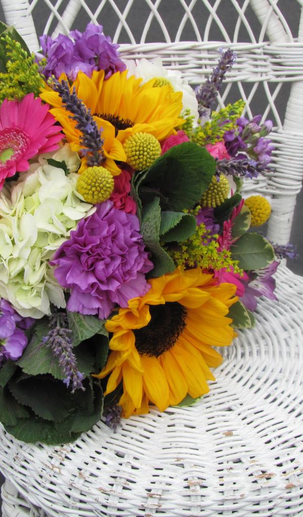 Wallpaper Bouquet with pink flowers dahlias, roses, gerberas and phloxes on a white chair
