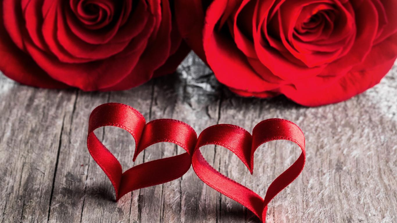 Wallpaper Two red roses with ribbon red hearts