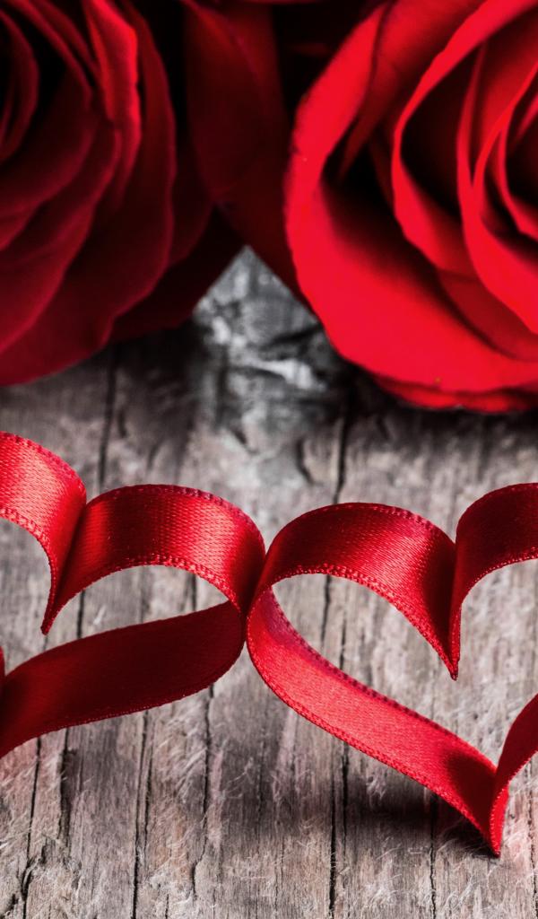 Wallpaper Two red roses with ribbon red hearts
