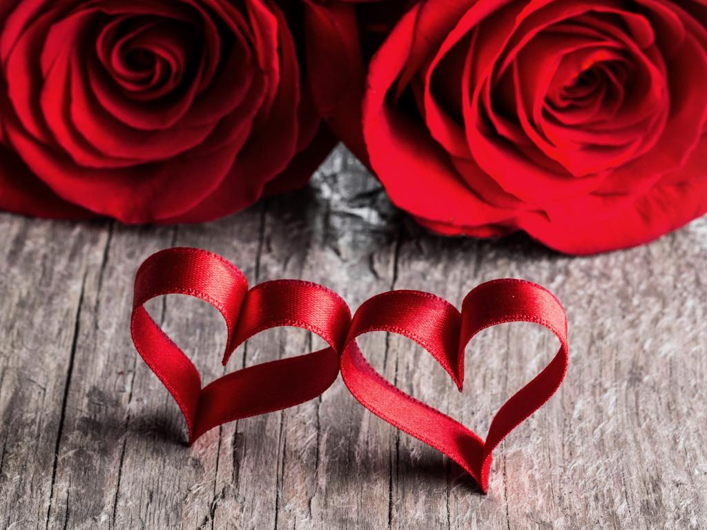 Wallpaper Two red roses with ribbon red hearts