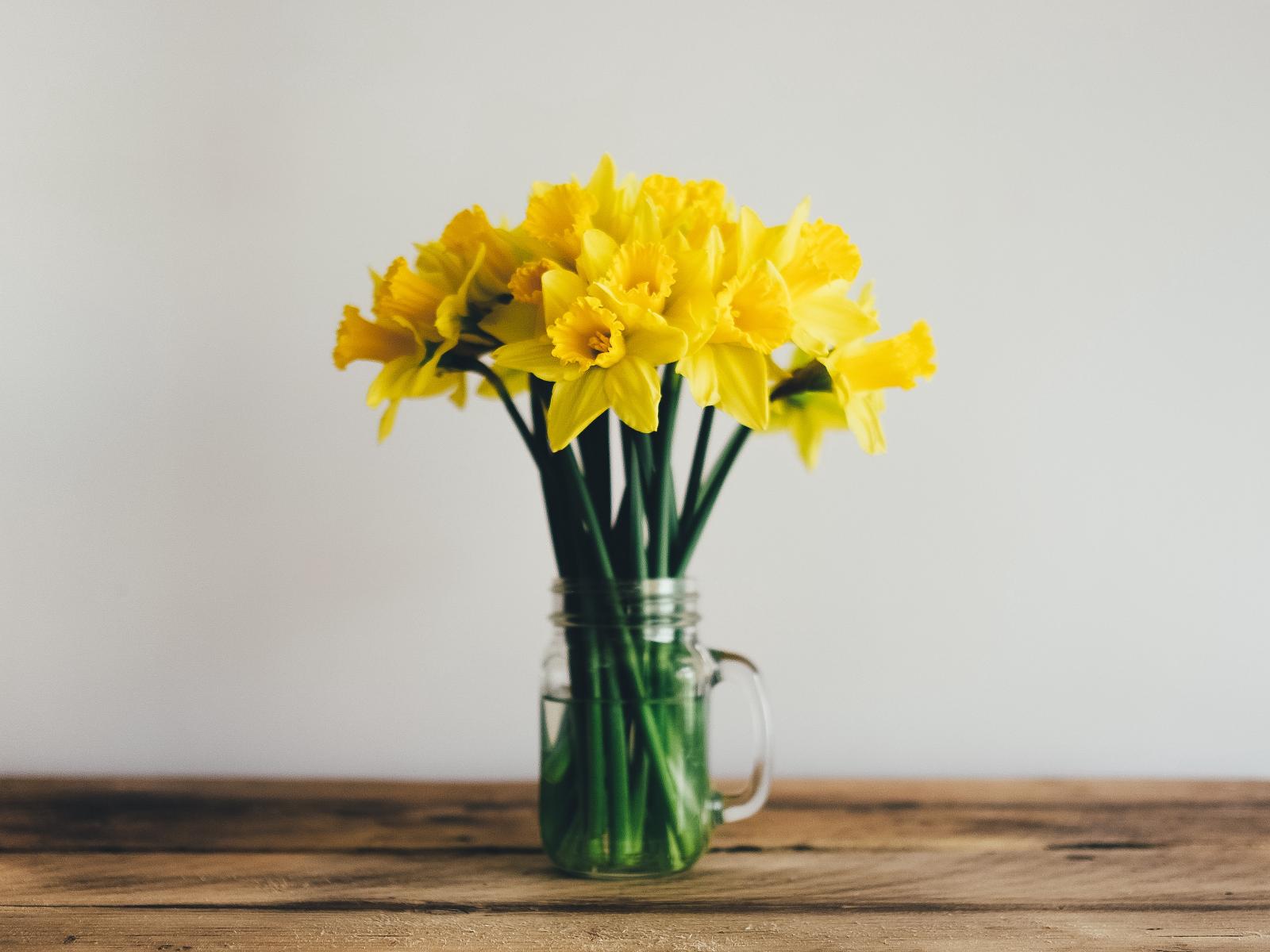 Wallpaper Bouquet of yellow daffodils in a glass vase on the table