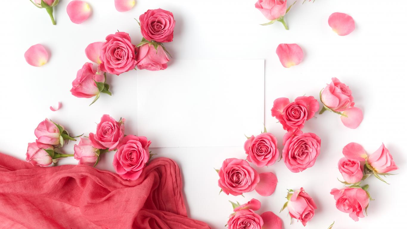 Wallpaper Pink roses with a white sheet of paper on a white background