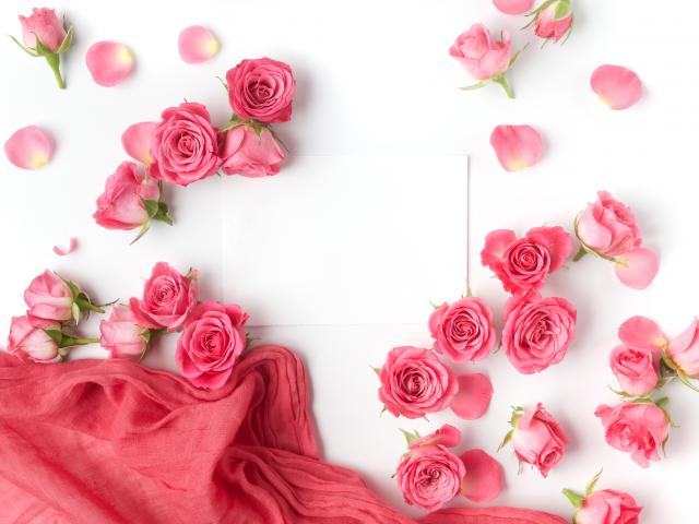 Wallpaper Pink roses with a white sheet of paper on a white background
