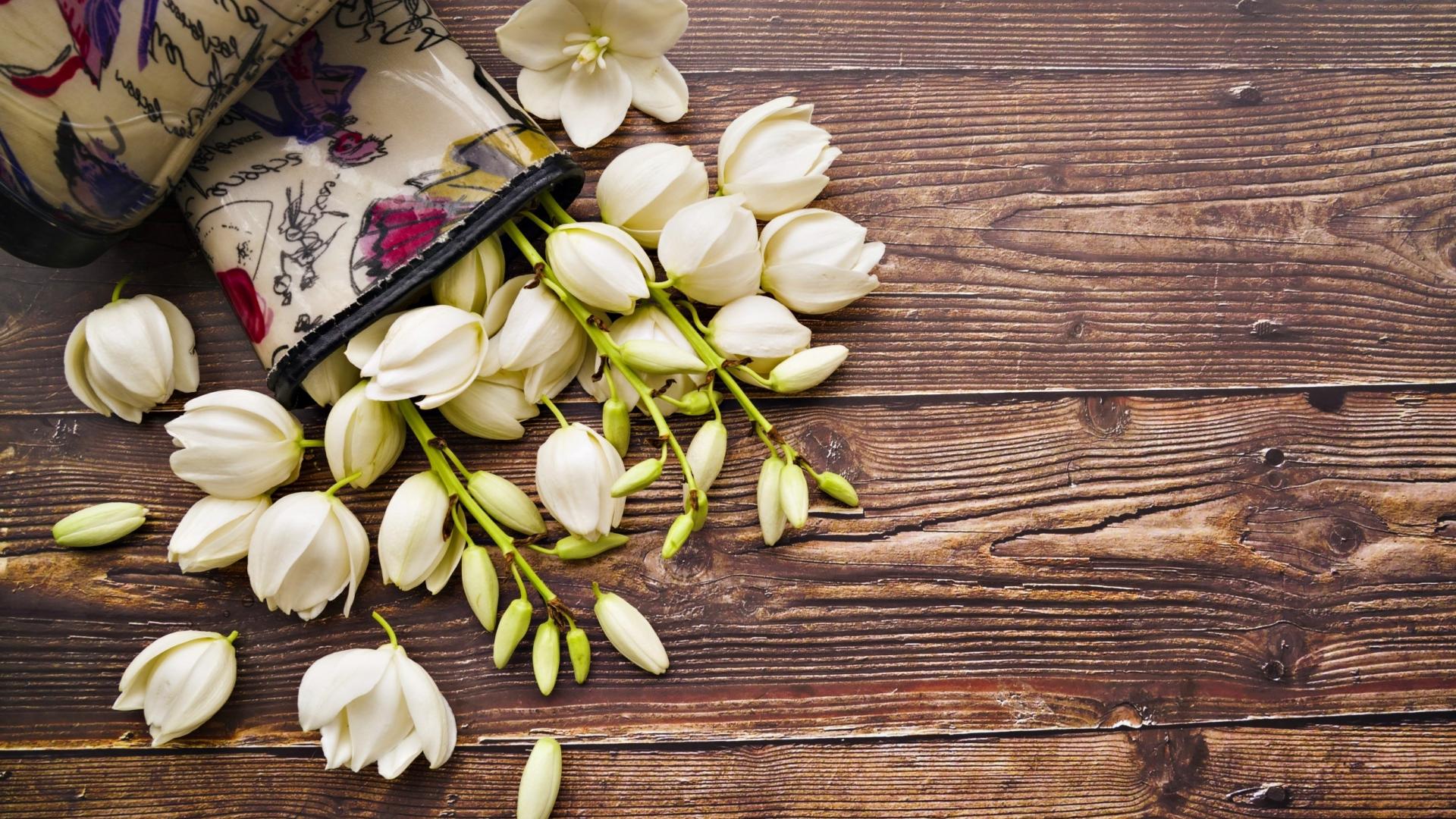 Wallpaper White flowers on wooden background