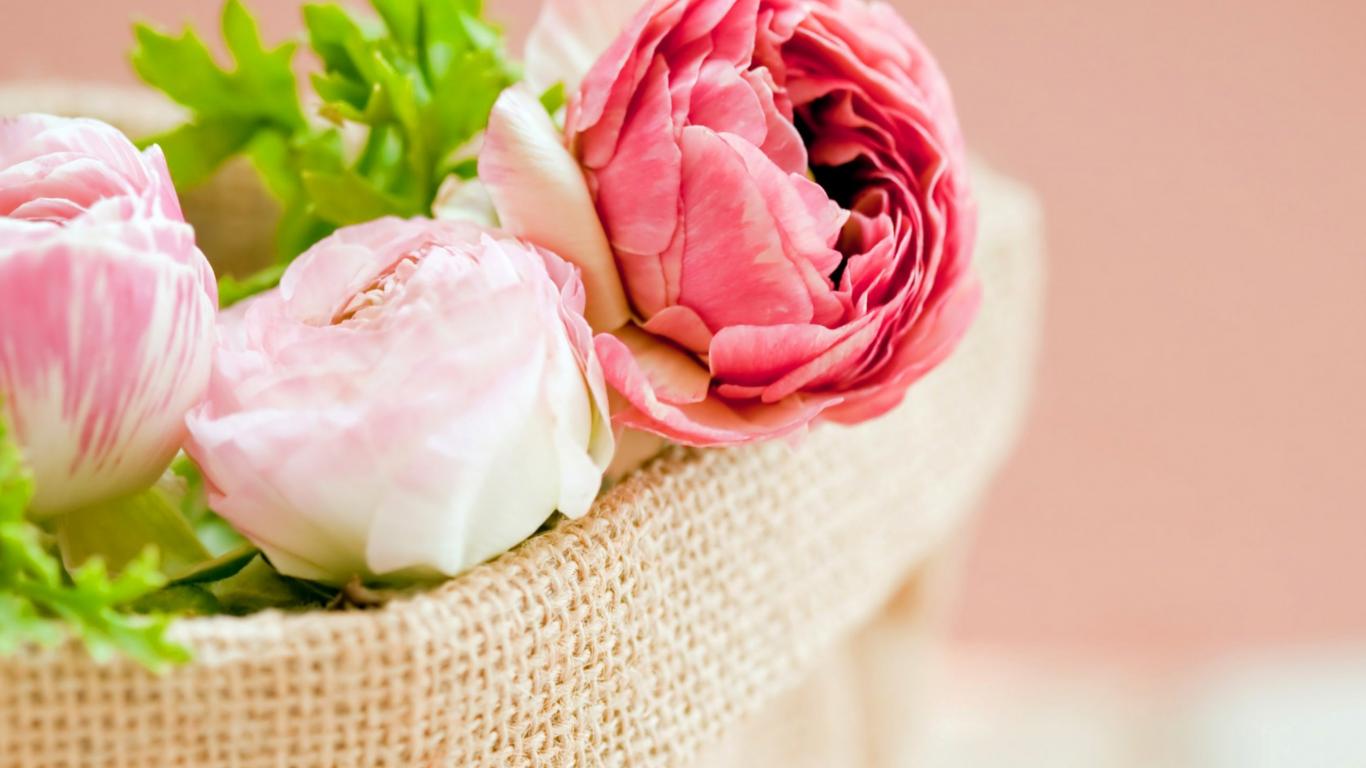 Wallpaper Pink buttercup flowers in a basket on a pink background