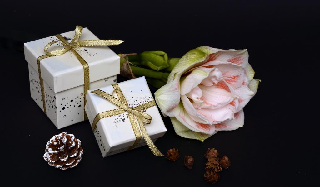 Wallpaper Two gifts and amaryllis flower on a black background