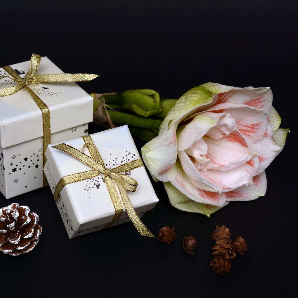 Wallpaper Two gifts and amaryllis flower on a black background