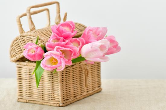 Wallpaper Bouquet of pink tulips in a wicker basket