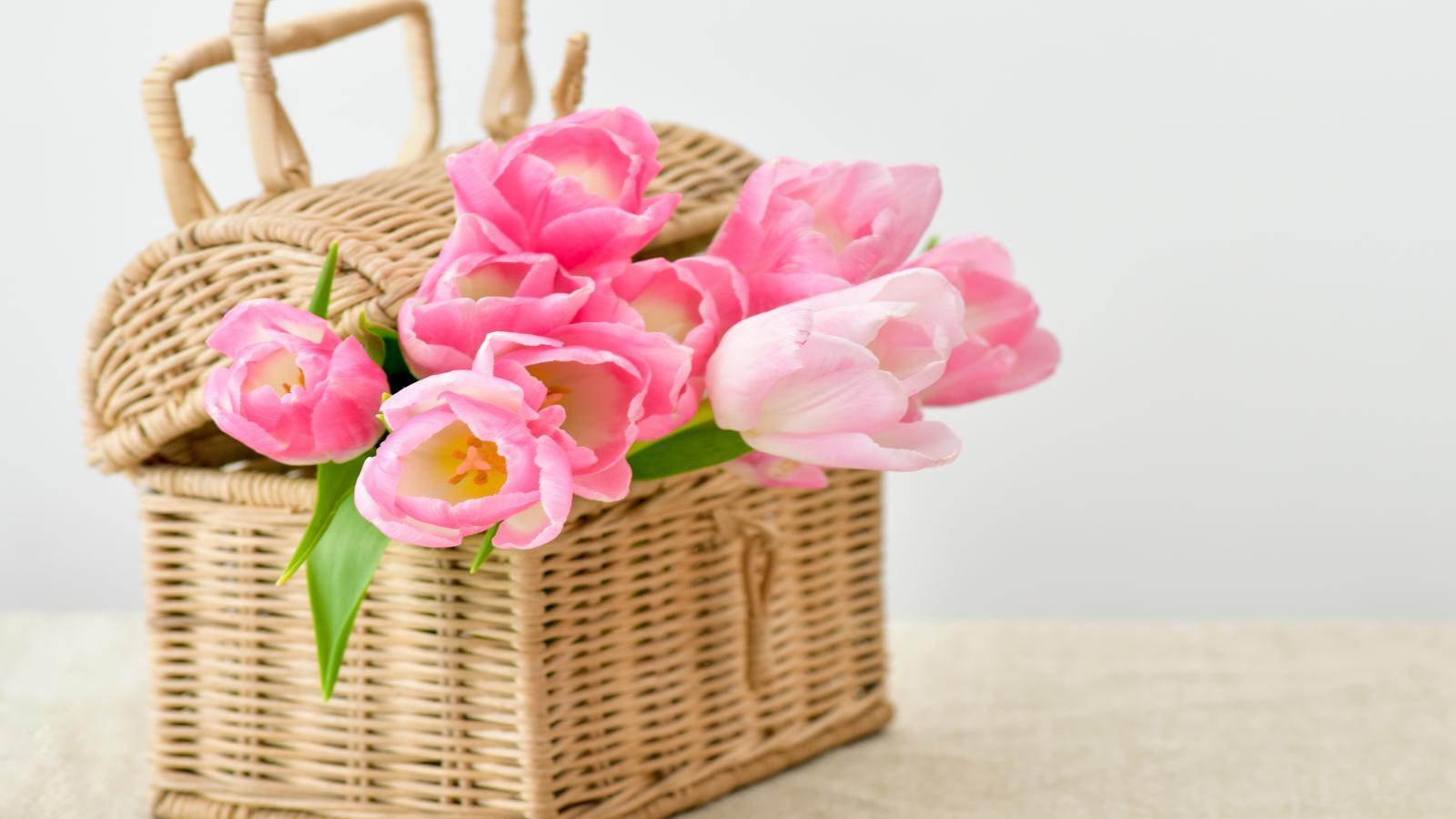 Wallpaper Bouquet of pink tulips in a wicker basket