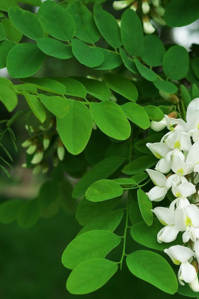 Wallpaper White flowers of acacia with green leaves close up