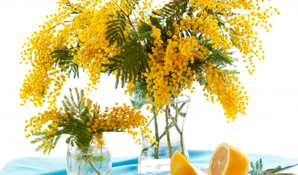 Wallpaper Bouquet of yellow mimosa in a vase on the table with lemon