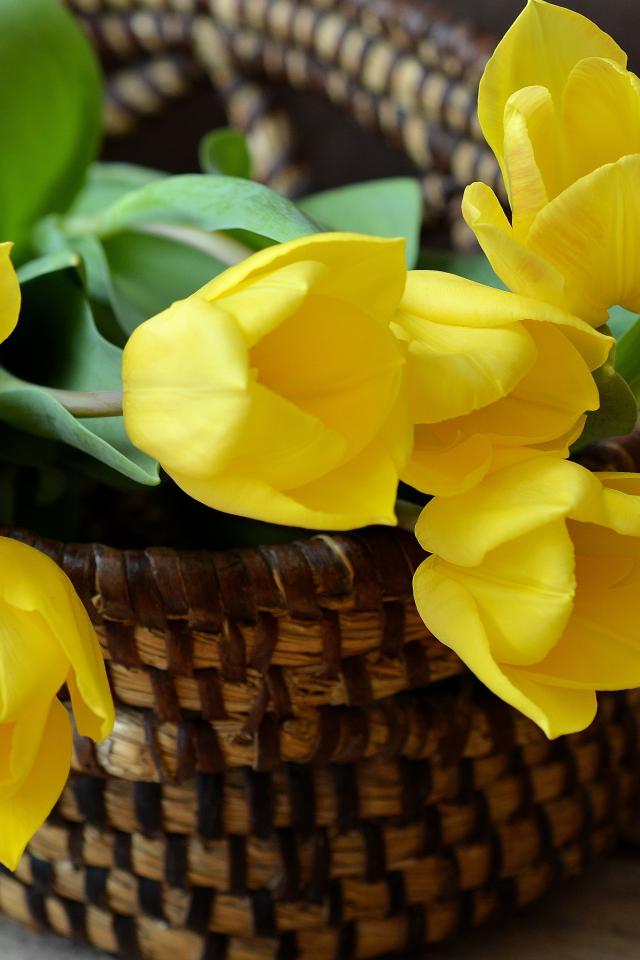Wallpaper Bouquet of yellow tulips in a basket on the table