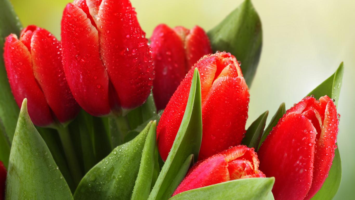 Wallpaper Bouquet of red tulips in drops of dew in a glass vase on a white background