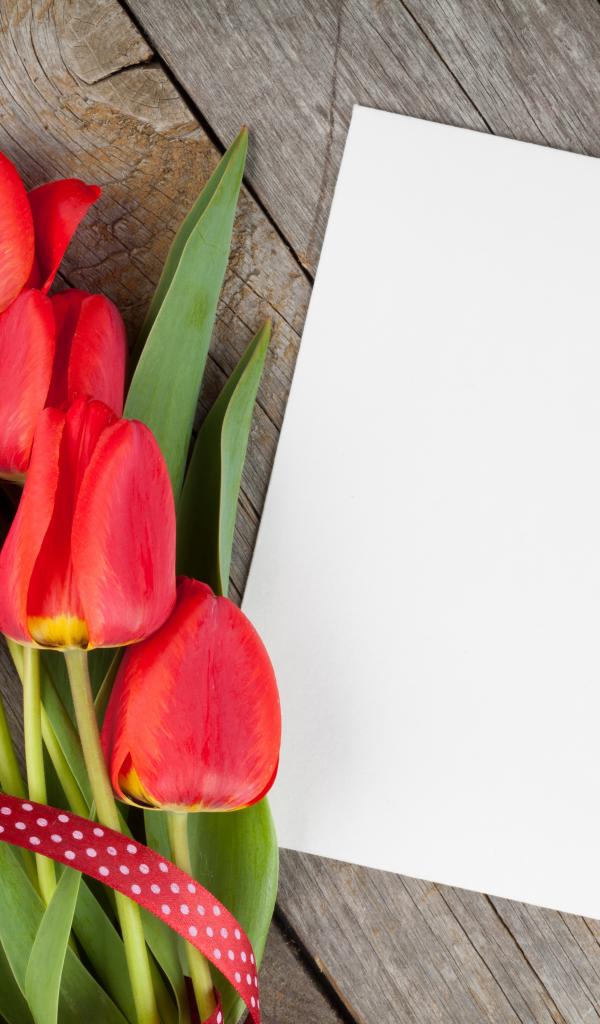 Wallpaper Bouquet of red tulips with a sheet of paper on a wooden table