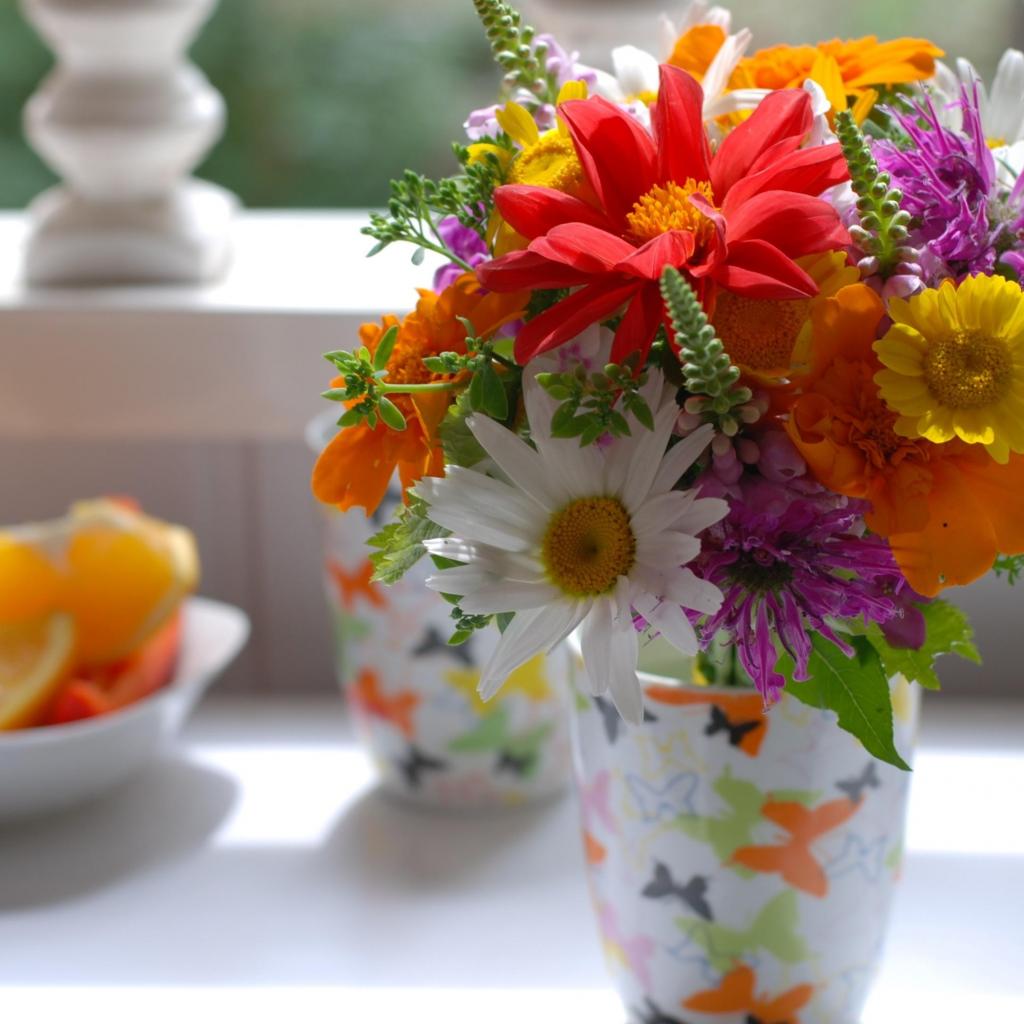 Wallpaper Bouquet of colorful garden flowers in a vase on the table