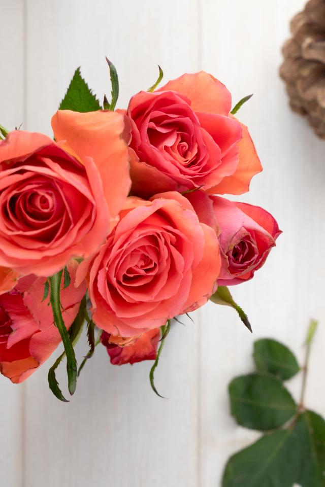 Wallpaper A bouquet of pink roses on a table with chestnuts and a cone