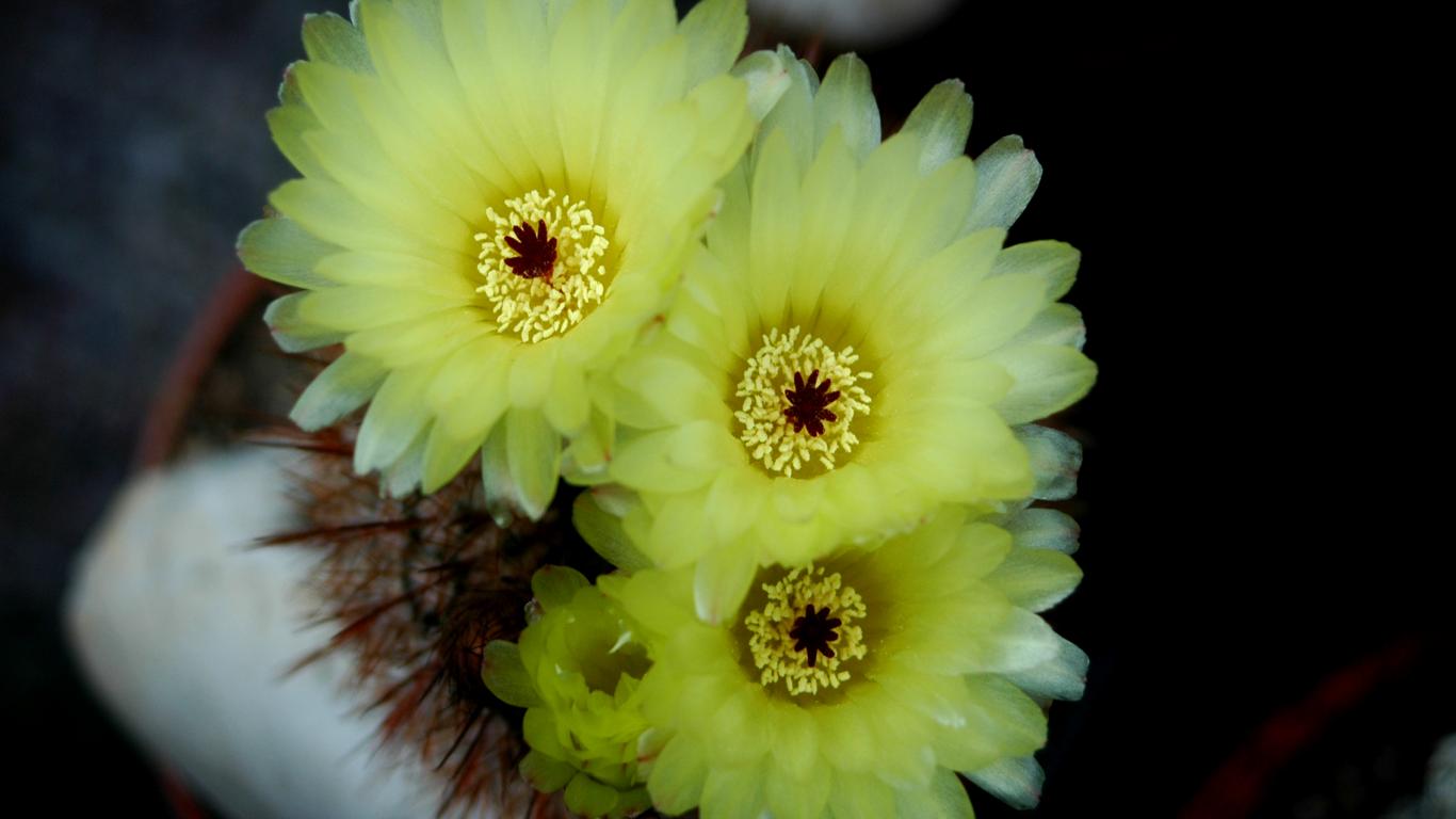 Wallpaper Delicate yellow flowers on a green prickly cactus