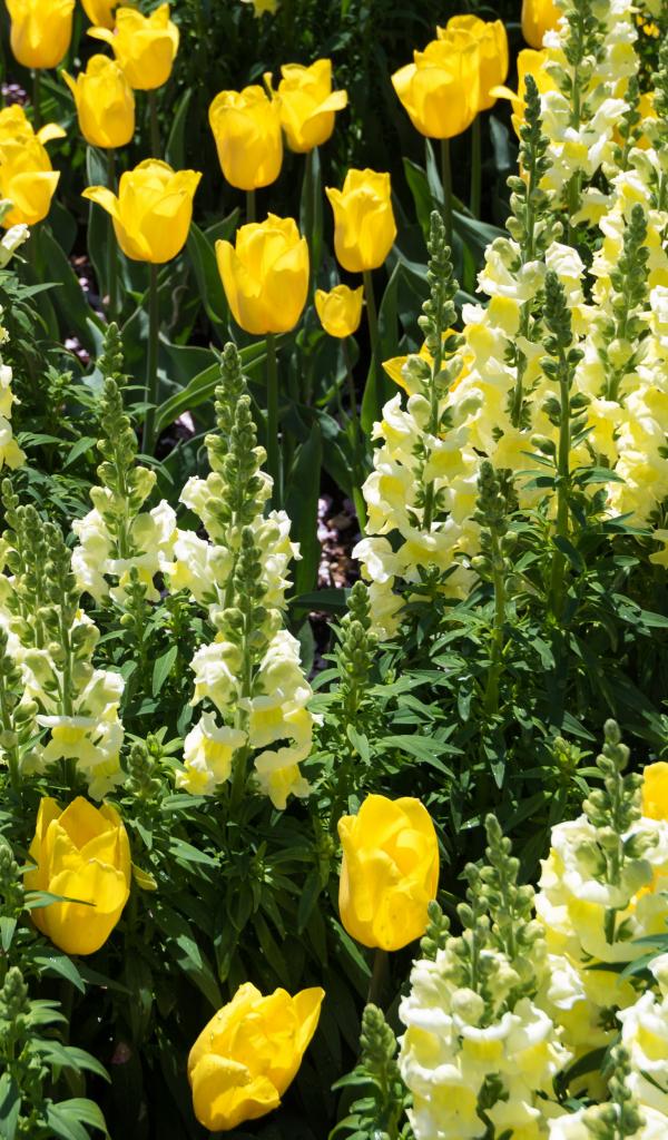 Wallpaper Beautiful yellow snapdragon flowers and tulips on a flowerbed