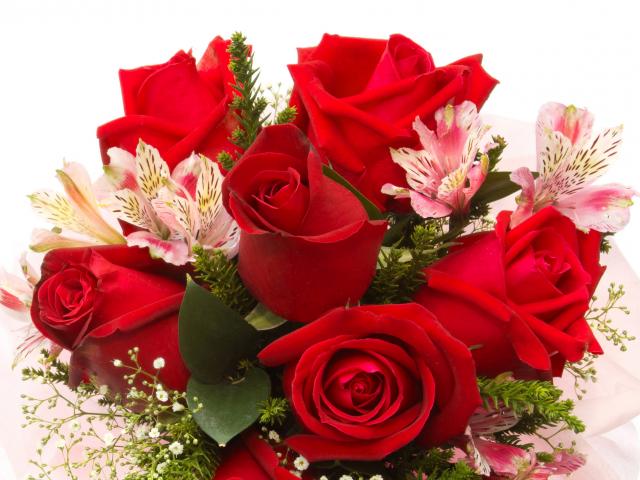 Wallpaper Red roses with flowers of Alstroemeria on a white background