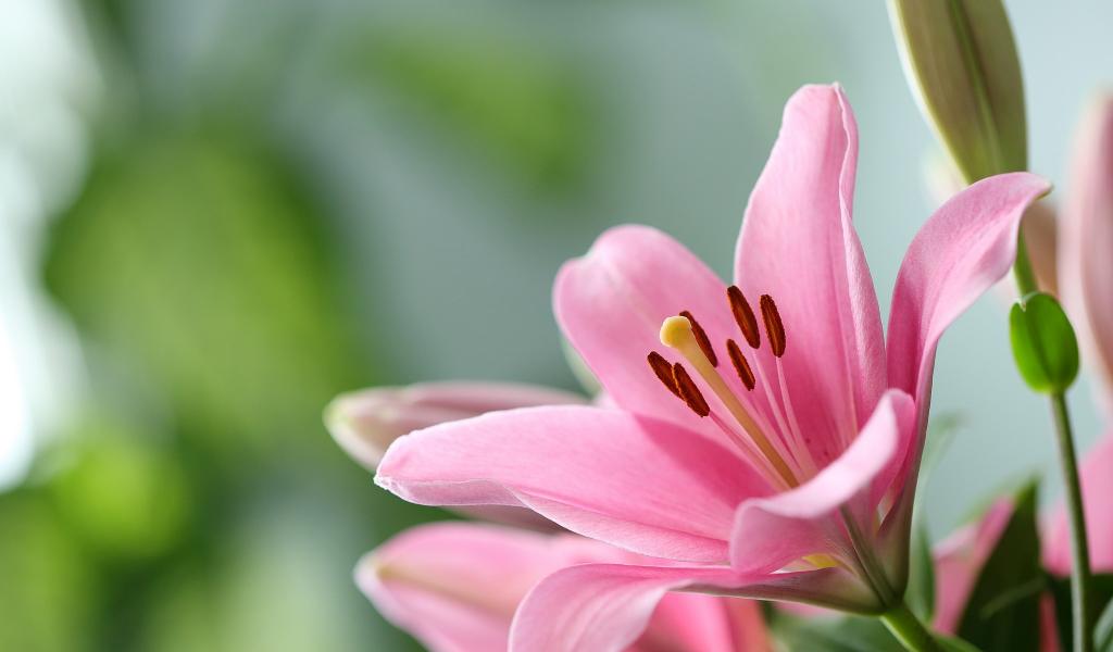 Wallpaper Delicate pink lily with buds on a green background close-up