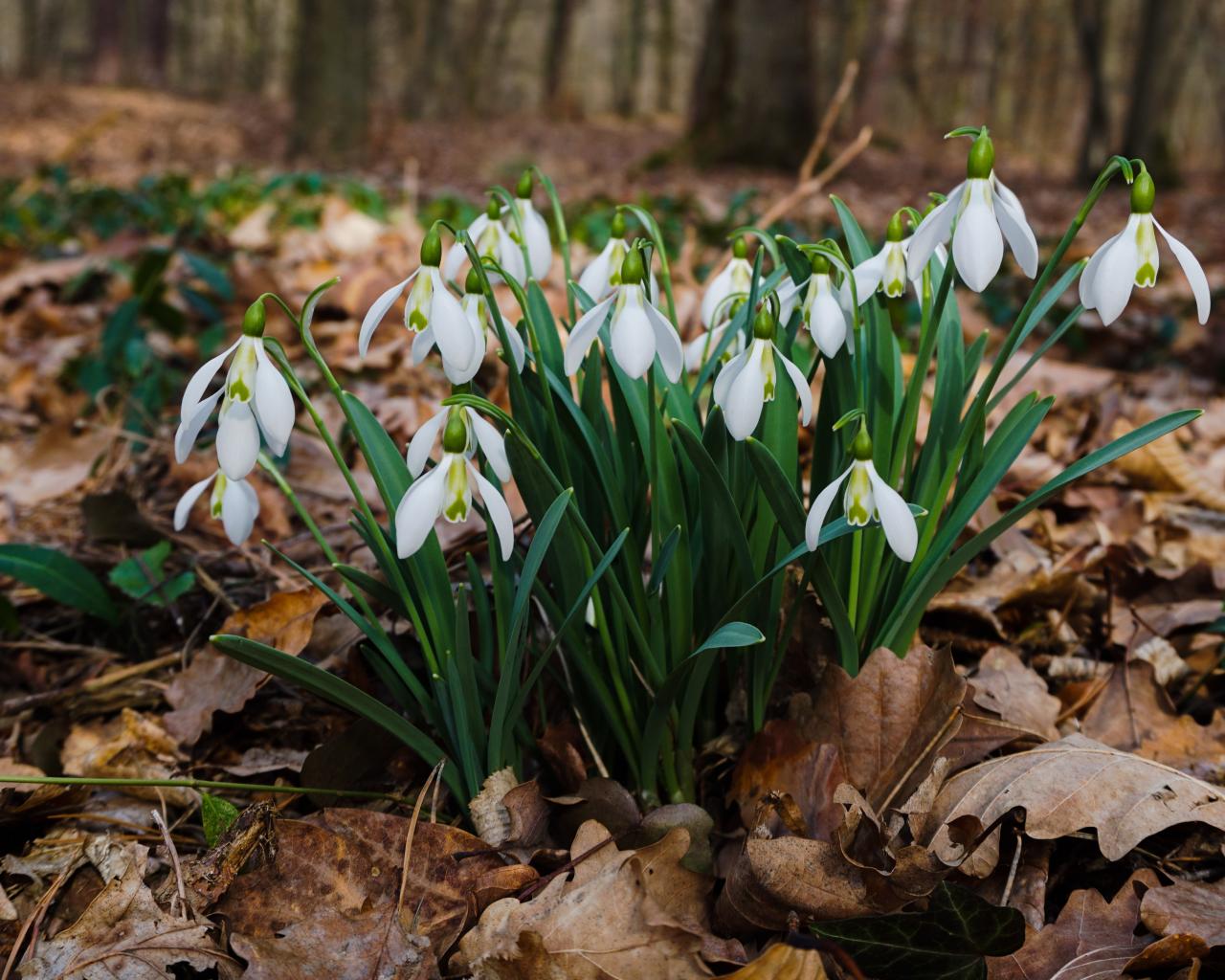 Wallpaper White beautiful snowdrops on dry foliage