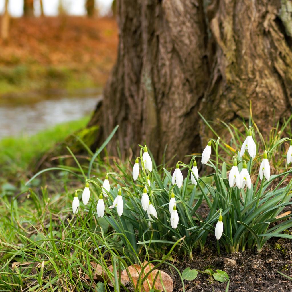 Wallpaper White first spring flowers snowdrops under a tree