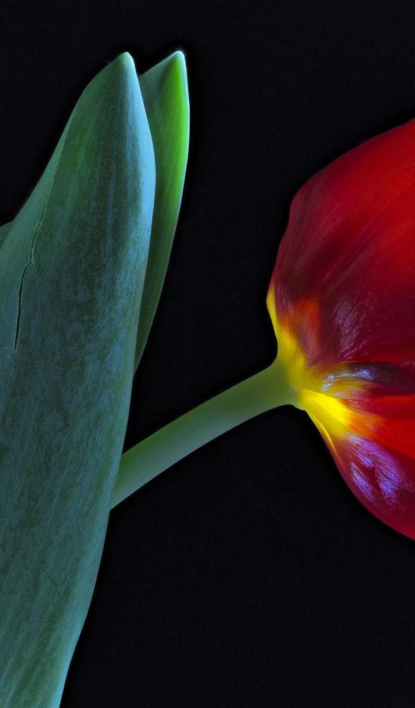 Wallpaper Tulip with green leaves on a black background
