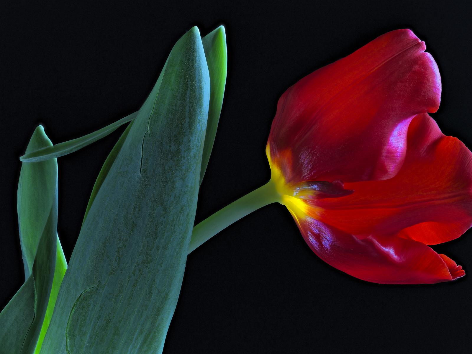 Wallpaper Tulip with green leaves on a black background