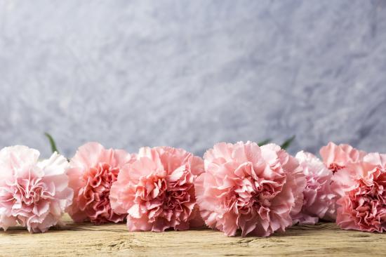 Wallpaper Pink carnations lie on a wooden table.