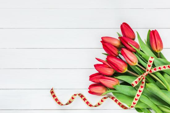 Wallpaper Bouquet of red tulips with ribbon on a gray background