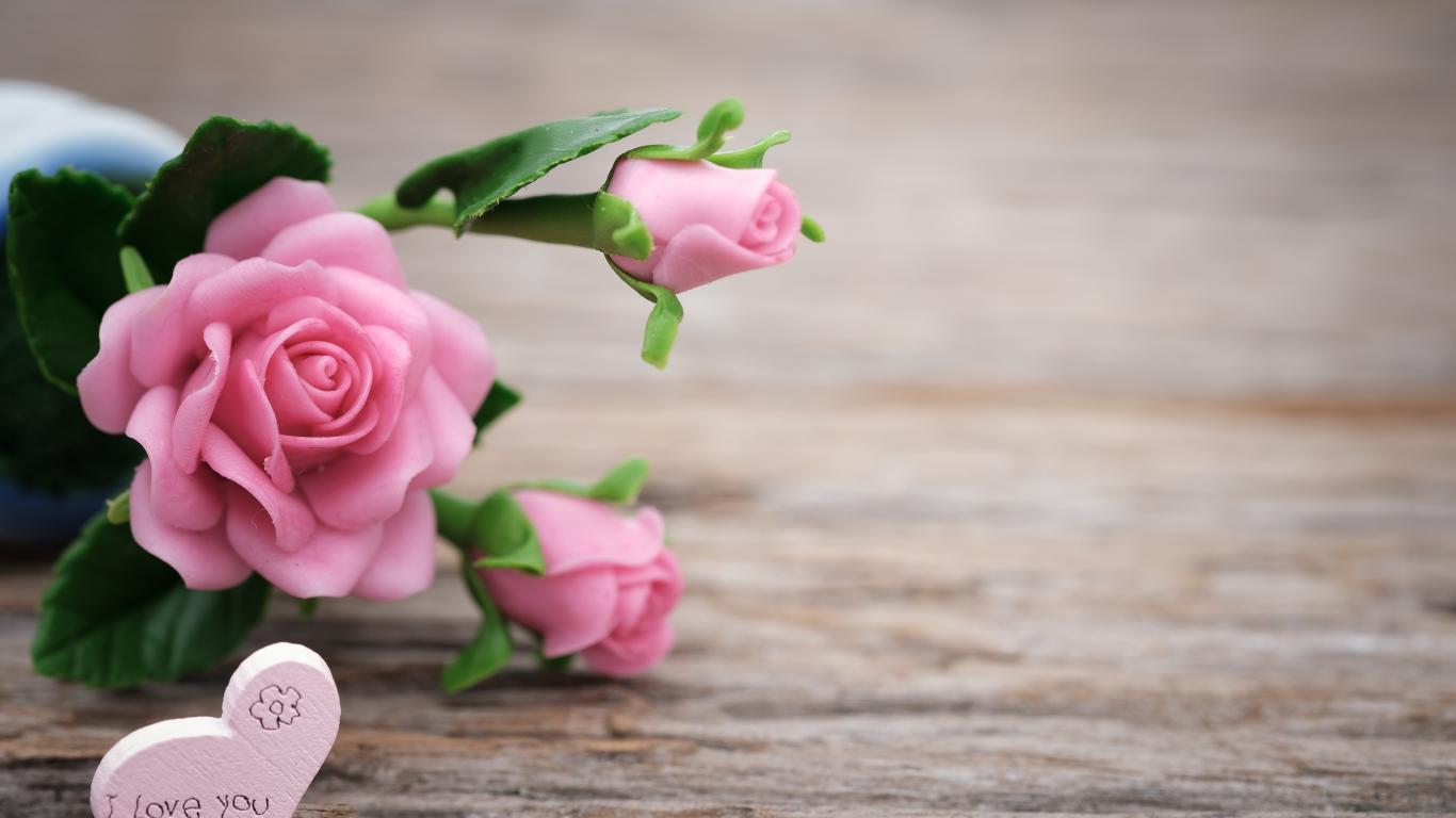 Wallpaper Pink artificial roses with hearts on a wooden background