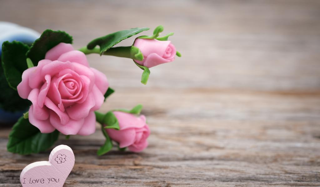 Wallpaper Pink artificial roses with hearts on a wooden background