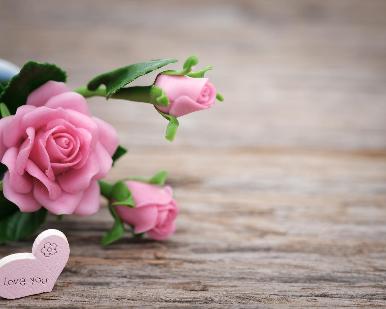 Wallpaper Pink artificial roses with hearts on a wooden background