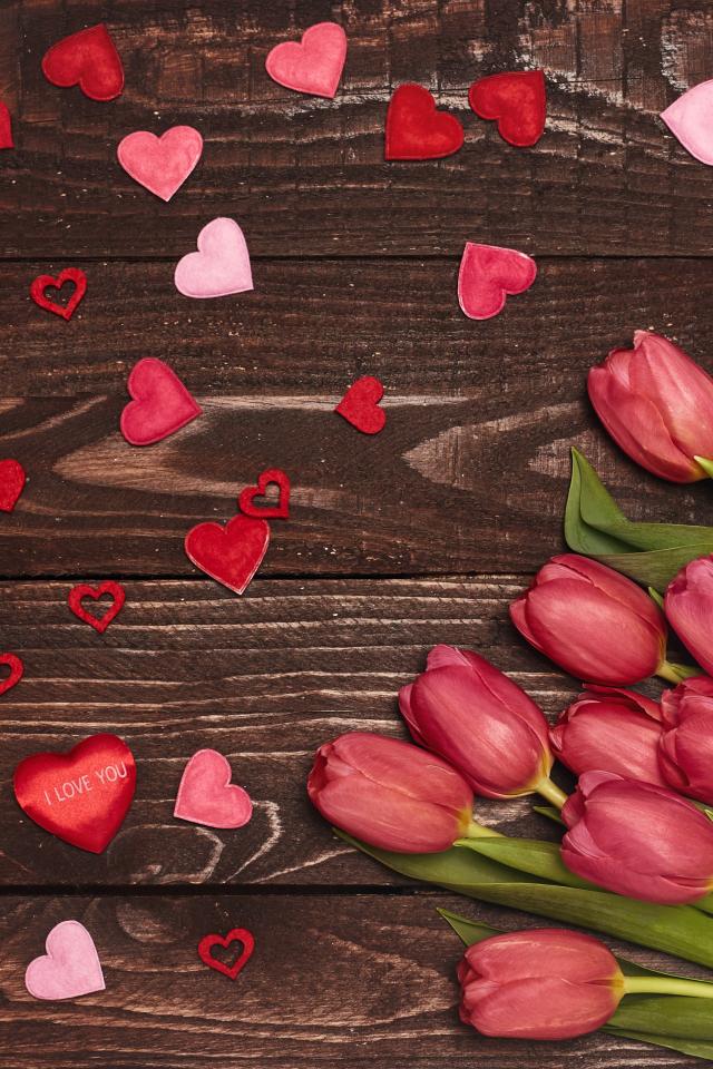 Wallpaper Bouquet of tulips on a wooden background with hearts