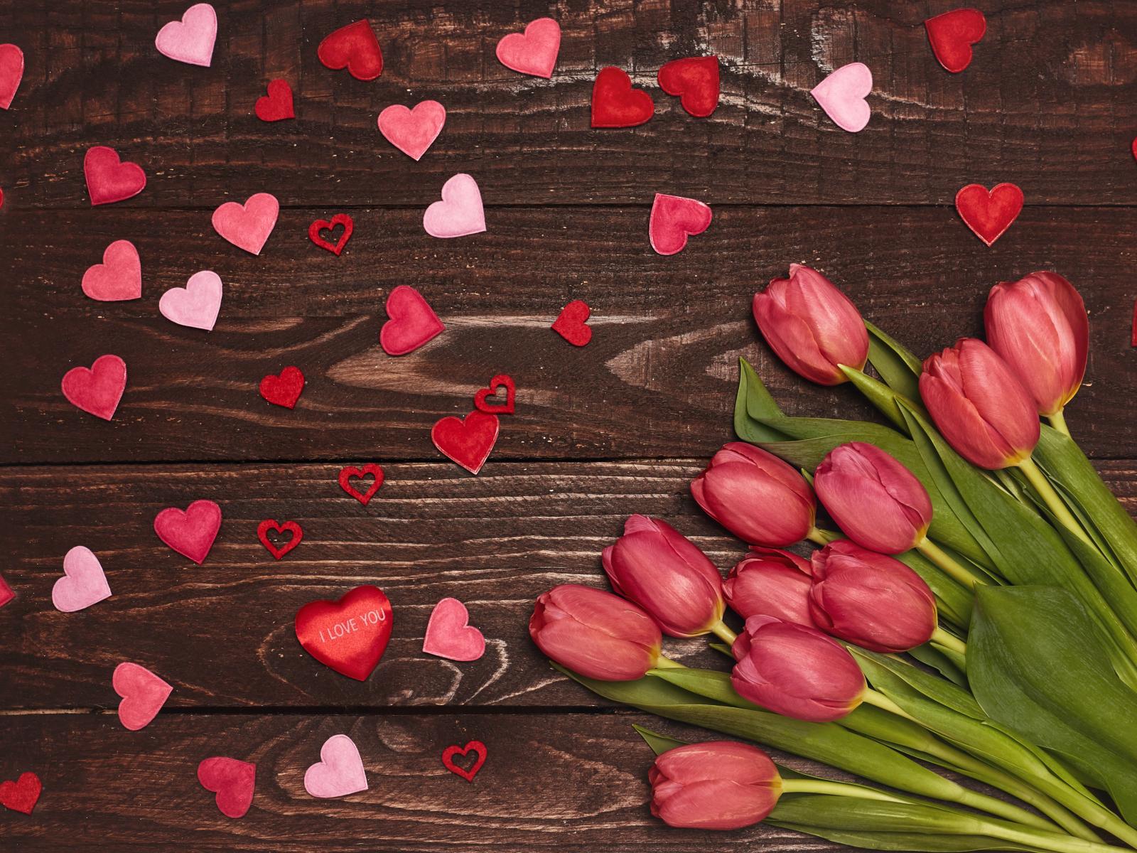 Wallpaper Bouquet of tulips on a wooden background with hearts