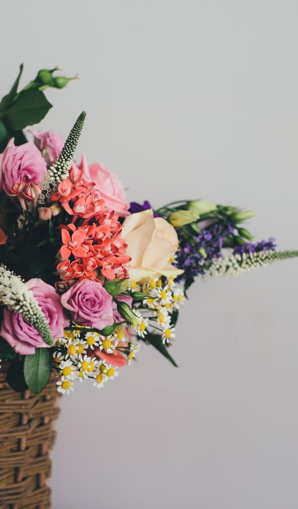 Wallpaper A bouquet of flowers in a basket on a gray background