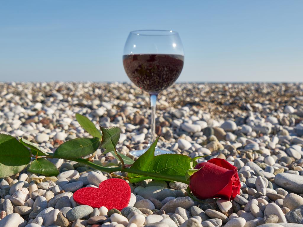 Wallpaper Red rose on sea pebbles with a heart and a glass of wine