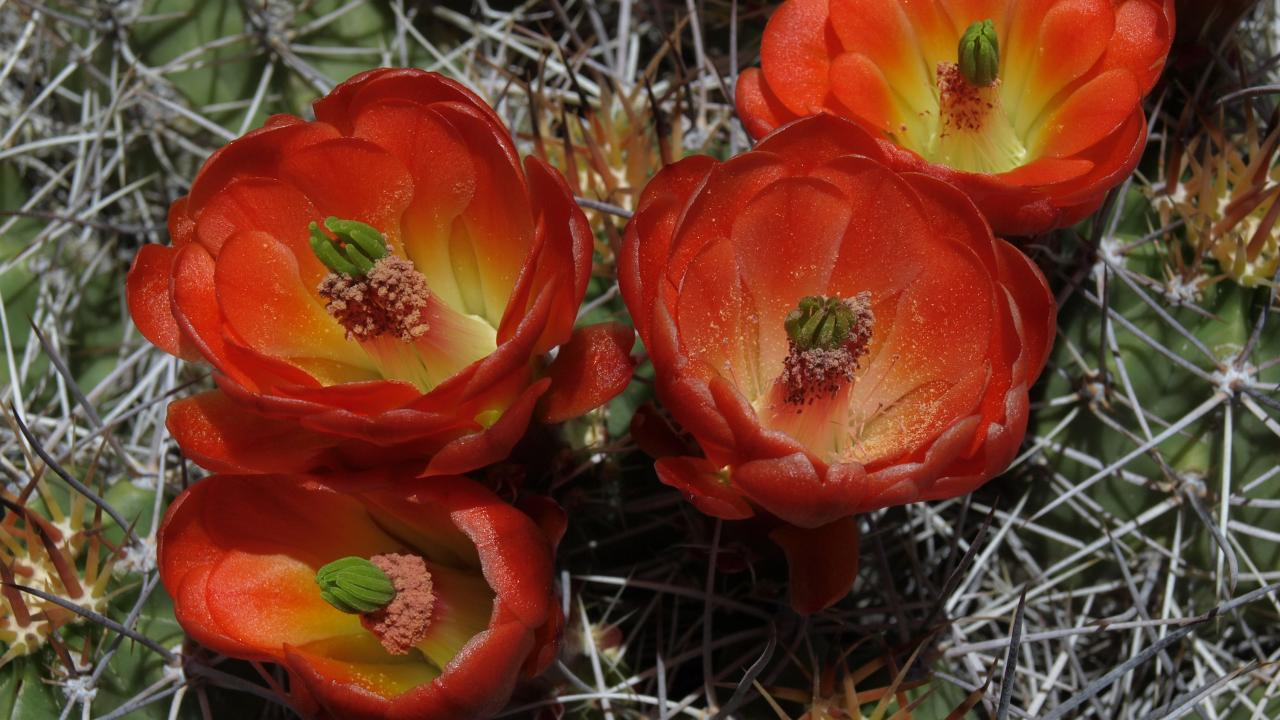 Wallpaper Beautiful red flowers of a spiky cactus close up.