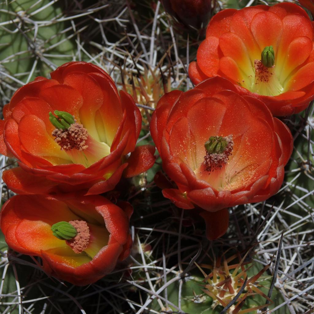 Wallpaper Beautiful red flowers of a spiky cactus close up.
