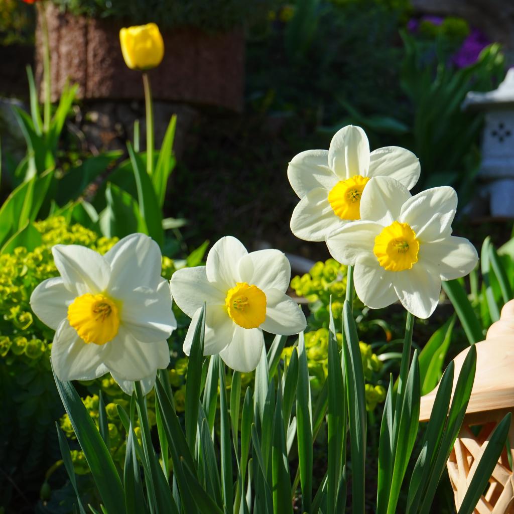 Wallpaper Lush white daffodils with green leaves under a blue sky