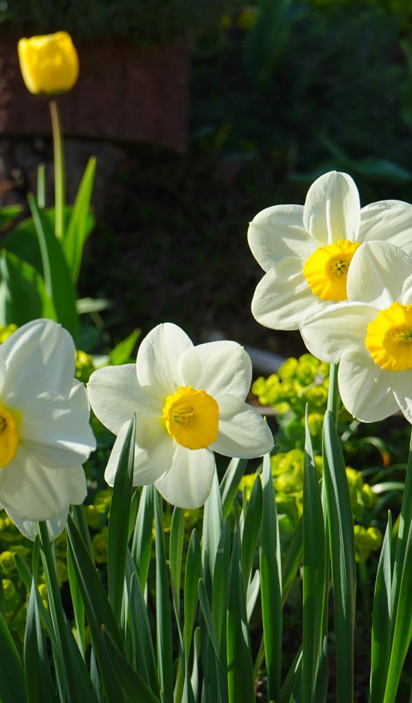 Wallpaper Lush white daffodils with green leaves under a blue sky