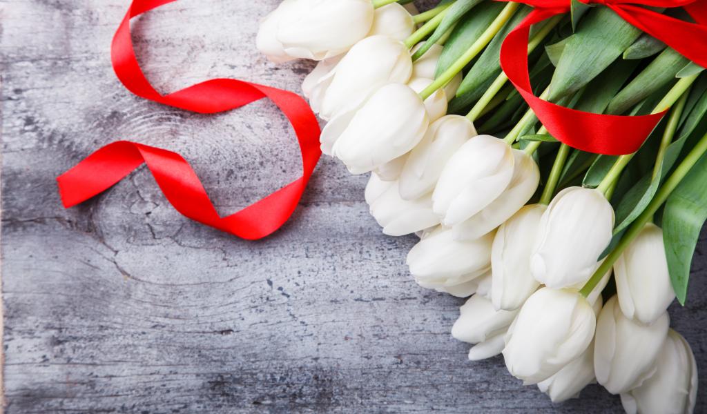 Wallpaper Bouquet of white tulips with a red bow on a gray table